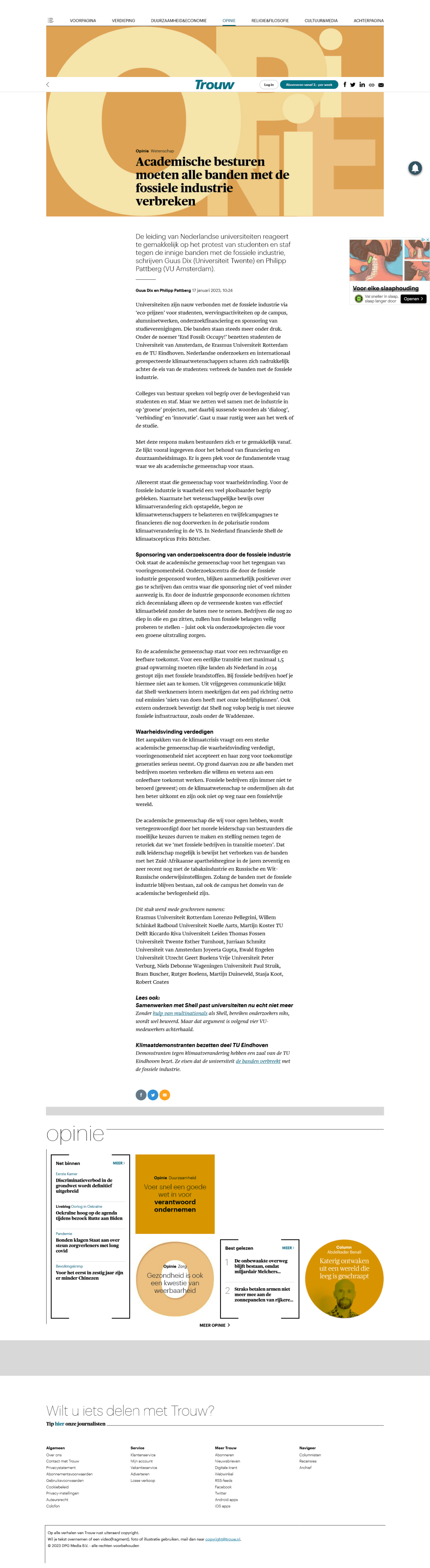 Check out this opinion piece (in Dutch) by Guus Dix and Philipp Pattberg (and representing several other supportive academics, including myself, see at the bottom) in today's edition of Dutch newspaper Trouw. It critiques universities' continuing ties with the fossil fuel industry. Very timely, especially after yesterday's occupation of the Binnengasthuis of the University of…Read more Opinion piece in the Dutch Newspaper Trouw
